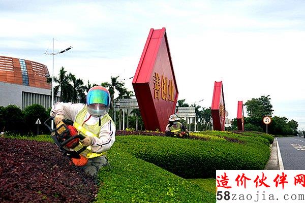 园林工人修剪玉林迎宾大道分车带的绿化植物