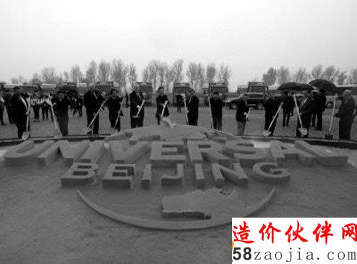 昨天上午9点,北京环球主题公园及度假区基础工程建设启动仪式在通州区项目场地举行。记者在现场看到,启动仪式现场周围相当大片的土地已经被平整清理。为了服务启动仪式,特意铺设了石子路,划出停车场,几十辆大货车和挖掘机排成一排,负责基础施工的工人在项目地同时启动挖掘机,标志该项目进入实质建设阶段。