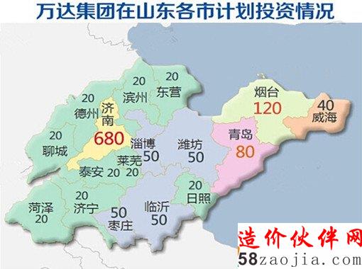 万达集团2001年就进入山东省投资,15年来已累计投资1000亿元,在济南、青岛、烟台、泰安等市投资14个万达广场、9个五星级酒店(含在建)。总投资500亿元建设的青岛东方影都是世界唯一拥有影视拍摄、影视制作、影视会展、影视旅游功能的特大型影视产业园,2017年建成开业后将成为世界电影新中心。