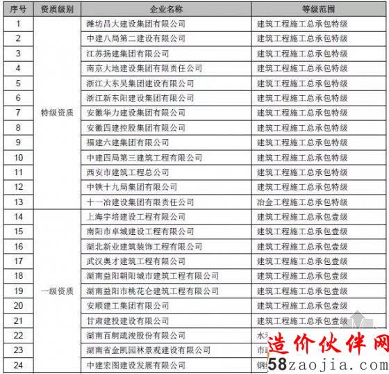 其中特级资质申请通过的企业有13家,一级资质申请通过的企业有11家。13家特级资质企业中:建筑工程施工总承包特级12家、冶金工程施工总承包特级1家。11家一级资质企业中:建筑工程施工总承包一级8家、水利水电工程和市政公用工程施工总承包一级各1家、钢结构工程专业承包一级1家。