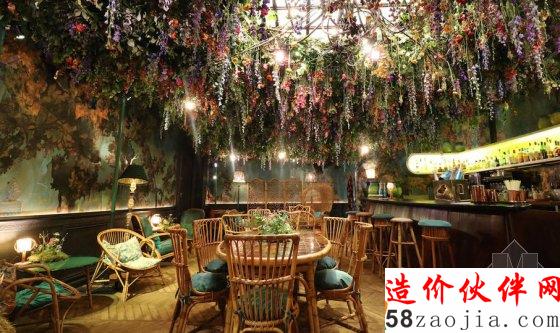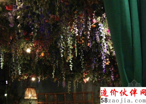 鲜花商 JamJar Flowers 装饰的是鸡尾酒餐饮区 Glade,这里原本就是餐厅里非常独特的地方,桌椅都采用了藤条,配合墨绿色的墙纸和垫子,有一种印度或东南亚一带的殖民风格。他们在天花板下使用上百枝花束,配合着星星点点的灯光,就像是打开的烟花。在鲜花下吃饭想必能感受到独特的花香。