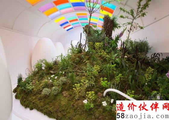 Sketch 的卫生间也非常特别,在天花板上使用了彩色的水晶,每个独立的卫生间就像白色的太空舱,非常奇妙。Carly Rogers Flowers 在通向卫生间的地方铺上了一片花园,有绿色植物和树枝。而在每个太空舱顶上,也铺上了小片的绿植。
