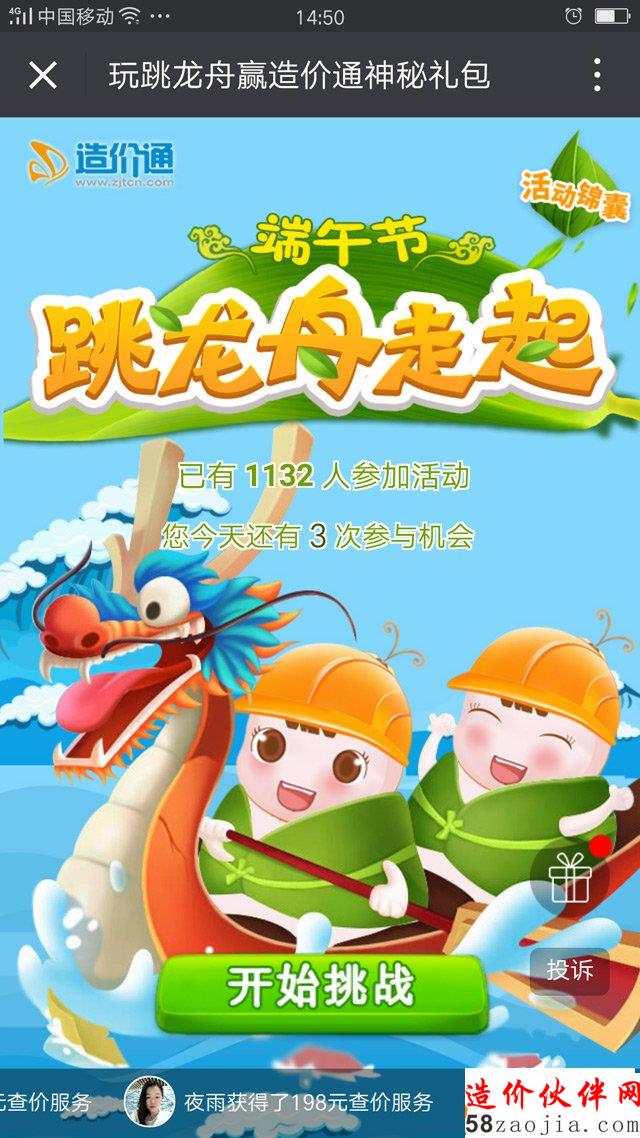 Step1:从造价通公众号菜单栏“活动”进入“跳龙舟赢大礼”游戏界面,点击右下方礼盒。