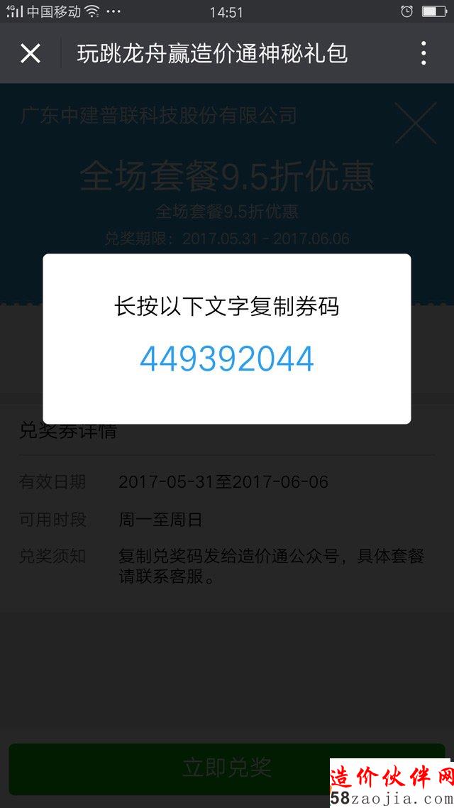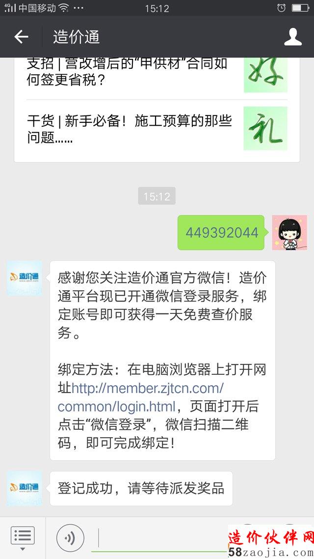 Step5:发送兑奖券码私信到造价通微信公众号,收到“登记成功”回复即说明兑奖成功。