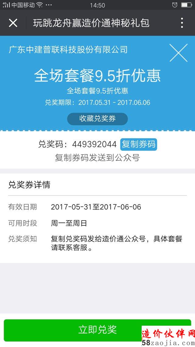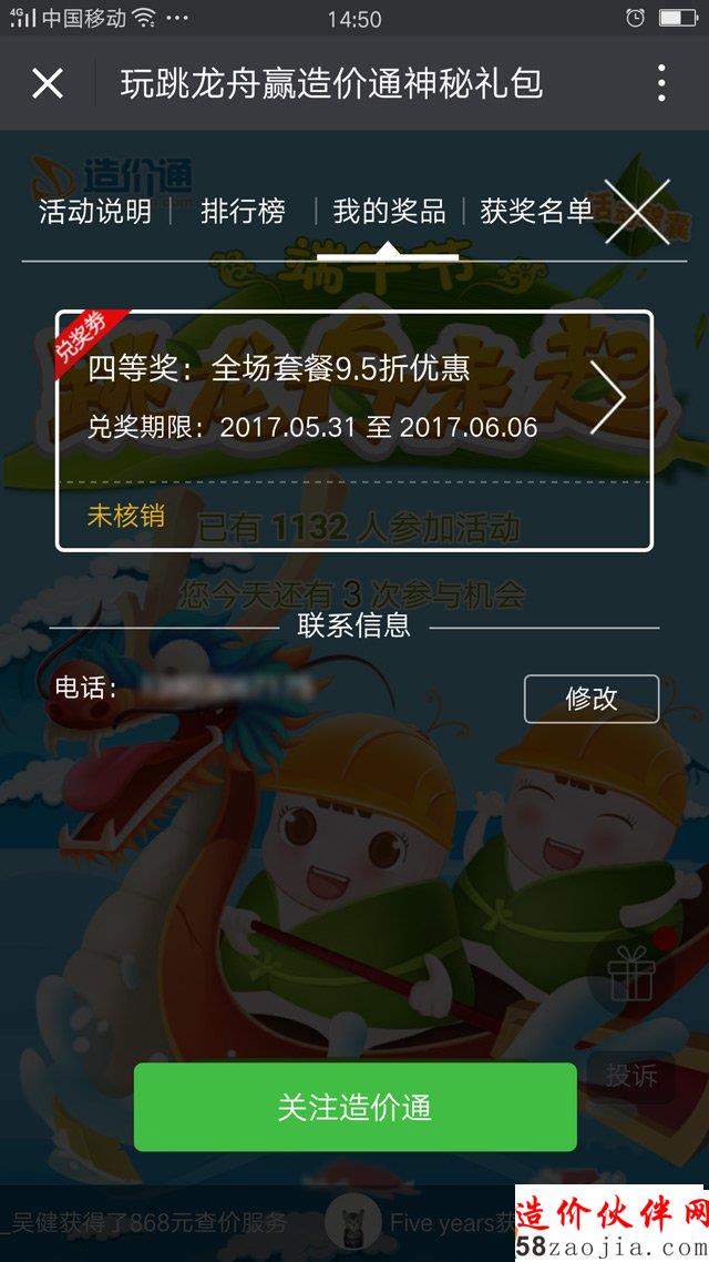 一、二、三等奖在兑奖3个工作日内开通,并将以短信通知。四等奖在2017年6月14日前购买造价通套餐有效,付款前请先与造价通客服人员确认享受优惠,逾期无效。