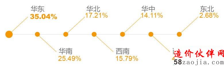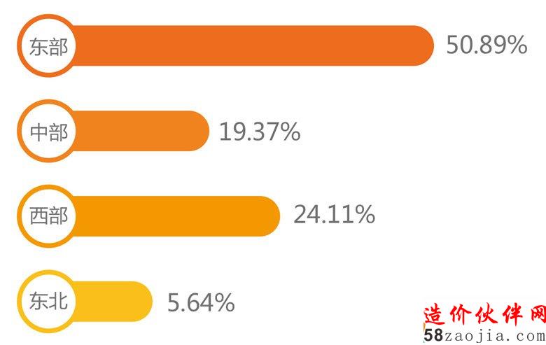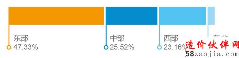 建设行业从业人员主要集中在东部、中部和西部,与固定资产投资各区域占比基本吻合。