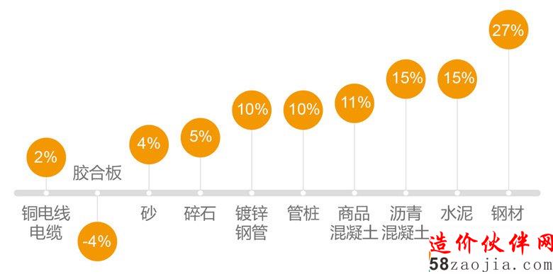 同2016年相比,90%的主材在近一年的时间内都有不同程度的涨幅,其中水泥、混凝土涨幅都超过10%,钢材则涨幅达27%之高。