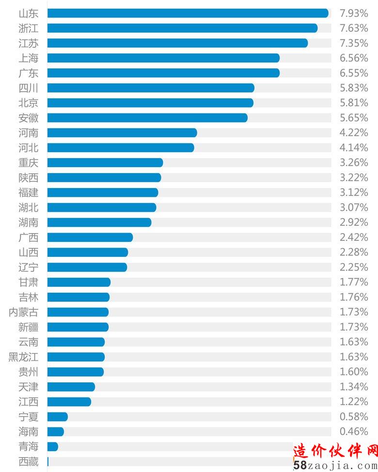 建设行业从业人员主要集中于东部沿海发达地区,其中前5名分别为山东7.93%,浙江7.63%,江苏7.35%,上海6.56%,广东6.55%。