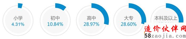 建设行业从业人员大专以上学历人数占比57.57%,初中及以下学历占15.15%。