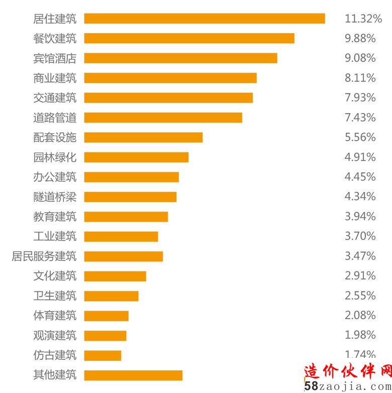 全国在建工程各项目类型中,居住建筑、商业建筑以及园林绿化建筑占比名列前三,分别为12.36%,10.28%,9.33%。