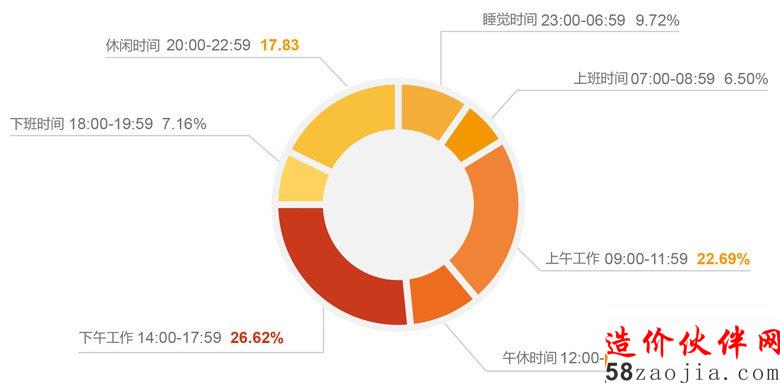 在9:00-11:59和14:00-17:59这两个上班时间段使用网络平台进行查价工作的用户占比49.61%,超过50%的人,在下班或休闲时间依然沉迷工作,甚至有9.72%的小伙伴凌晨还在奋战,一直听说建设行业人民加班成狂,真不是吹出来的。