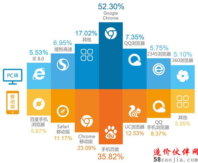 PC端,Google Chrome的使用率最高,达到52.3%;移动端,最受欢迎的是手机百度,占35.82%,其次是Chrome,占23.09%。