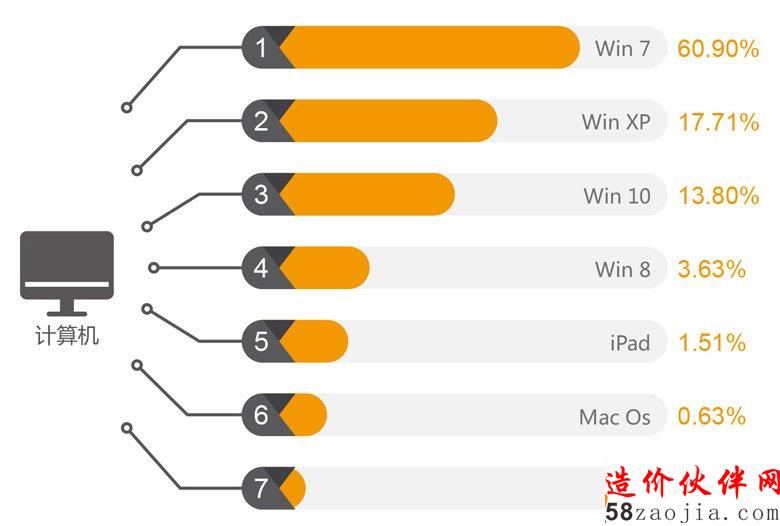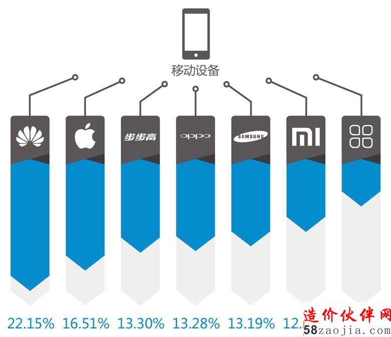 使用win7的行业人员占大多数,达到60.9%,尽管微软停止了WinXP的更新支持,仍有17.71的人在使用,windows系统依然是大家使用的主流,绝大多数人的首选。移动设备中使用人数最多的是华为手机,占22.15%,其次是iPhone占16.51%,而除了华为、iPhone、步步高、OPPO、三星、小米等主要智能机品牌以外,其他机型的使用率仅为9.35%。