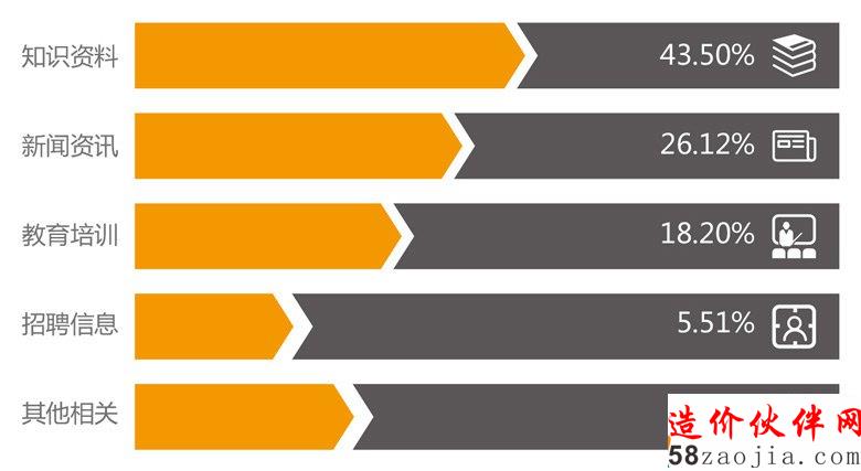 除了正常工作以外,用户还喜欢通过网络获取知识资料、新闻资讯、教育培训、招聘信息等,其中获取知识的意愿最强烈,占比43.5%,其次是新闻资讯,占比26.12%。