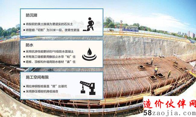挖至坑底,就该给管廊“铺床单”了。“床单”关键得瓷实、耐用。“管廊设计施工的关键控制之一,就是防止沉降。”中国中冶管廊研究院副院长李跃飞比喻道,管廊在土体稳定性高、承载力高的地下区域内建设相对容易,“如果建在软土地基上,就必须采取特殊的技术措施。”纺四路的地下土壤多为湿陷性黄土,有些“黏软”,为此项目人员特地在基坑底部换填了用石灰与黏土拌和而成的石灰土,足有半米之厚。此外,管廊在结构上还被“切割”为30米一段,中间用3厘米宽、伸缩性更强的橡胶止水带相连。“这样,即便有一段沉降了,也不会 拽 着相邻区段一起下沉。管廊柔性更强,不那么 脆 了,抗震性能也更好。”孔繁锋说。