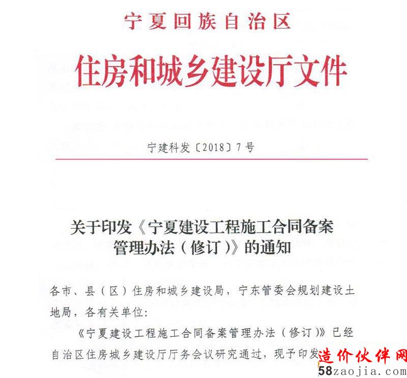 日前,宁夏回族自治区住房和城乡建设厅发布关于印发《宁夏施工合同备案管理办法(修订)》的通知(宁建科发 [2018] 7号),具体内容如下所示: