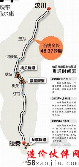 该高速沿线均为高山峡谷地形,可供修高速的土地资源极为有限。为此,施工方案中设计了大量的隧道、桥梁。全长48.37公里的映汶高速,桥梁长12.5公里,隧道长25.5公里,桥隧比超过75%。正是因为桥隧比非常高,加之一些工程穿越多处断裂带,施工难度大,因此映汶高速的造价也达到了近50亿元,平均每公里造价超过1亿元,在全省高速公路的单位造价中,仅次于正在修建的广(元)甘(川甘界)高速。