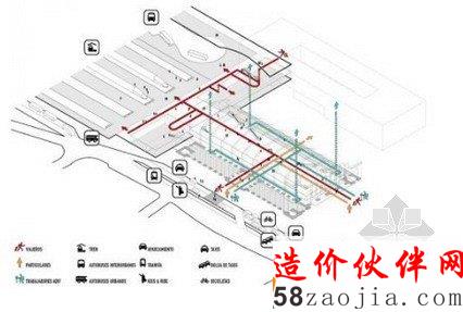 这是由MVRDV设计的西班牙拉科鲁尼亚车站的项目方案,这个新的车站将既有的车站转换为一个当代的多形式枢纽。除了既有的车站,新的交通中心还将结合高铁技术,城市新的公车站及一个新的汽车公园。除了占地8000平方米的火车站设施及13000平方米的公车站设施,项目还预想了未来办公,商业空间,酒店空间及公共公园空间。考虑到新车站将是城市新元素,设计没有将其塑造地特别大规模,以减少对于城市流通的阻滞,相反,所有的设施都是以高效紧凑的方法进行组织的,所有的车辆都平行流通,一个新的转换大厅将其连接。出租车,下车区,当地的公车等沿着火车及地区公车平行分布。