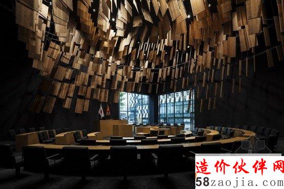 这是由建筑都市设计事务所设计的位于日本长冈市的市政厅项目,随着城市及其规模的不断扩大,公共建筑都被推到了郊区,大多是孤立的混凝土盒子。设计师力图扭转这种局面,将市政公共建筑重新拉回到城市中心,这个项目就是为打造真正的“城镇中心”,将建筑置于轴心,人们不管从哪个方向都方便到达,它与人们的每日生活产生了紧密的联系。设计师还采用了很多日本传统的设计概念,使之成为一个公共的聚集的空间,它不再是一个混凝土盒子,空间周围环绕亲密的设施,这些设施都是由木板或是太阳能板做成的。