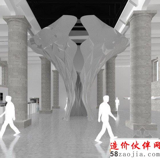 通过装置展览,事务所特别希望探索的是轻质壳体与可拉伸结构之间的关系。事务所已经设计了一些这样复杂的壳体和可拉伸的结构,在本次双年展上事务所将首次将两者结合在一起。Arum shell(尸臭魔芋壳体)是一个用褶皱金属做成的装置,设计师将在装置周围环绕事务所的研究,其中包含一些伟大开拓者的优秀代表项目。