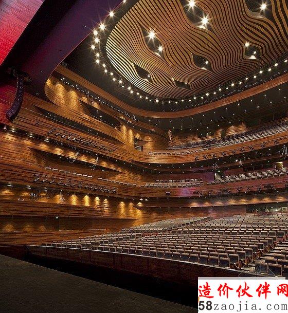 The architectural concept is unique: inside the steel wings are thousands of LED lights, which make it possible to change the color of the wings according to the character of the performances. This is possible, because the underside of the wings is covered by perforated aluminum panels. Another special feature is the ‘forest‘ of 50 light columns, each 9m high, which start from the main entrance square, support the roof of the central lobby and continue outside of the lakeside entrance into the lake. There is a strong Chinese feature that runs throughout the whole building: the large scale use of bamboo which is both a traditional and a modern Chinese material. There is also a material with a Finnish character: almost twenty thousand specially designed glass bricks cover the curved wall of the opera auditorium in the lakeside lobby. Finnish nature, lakes and ice, were the architectural inspiration.