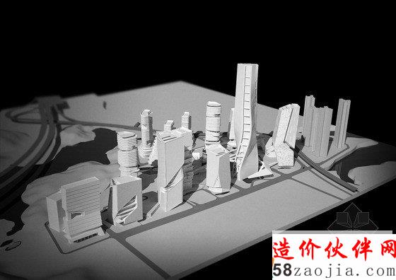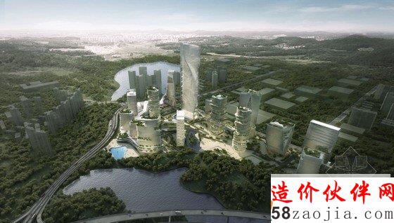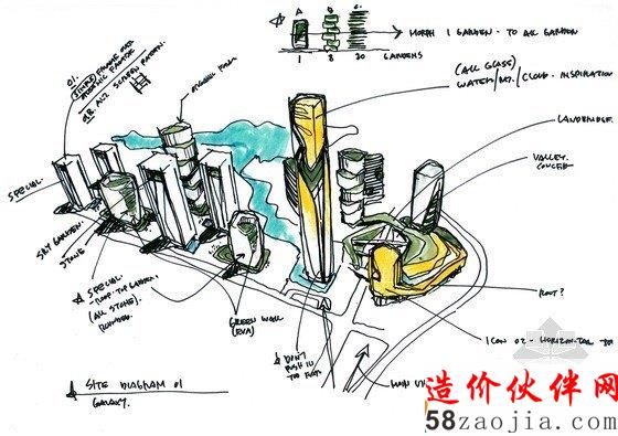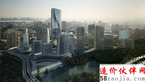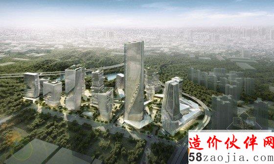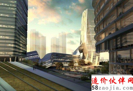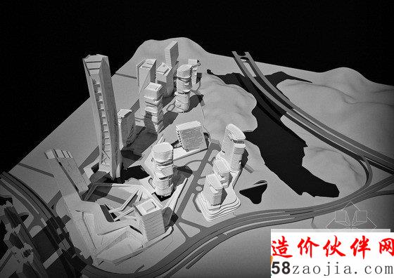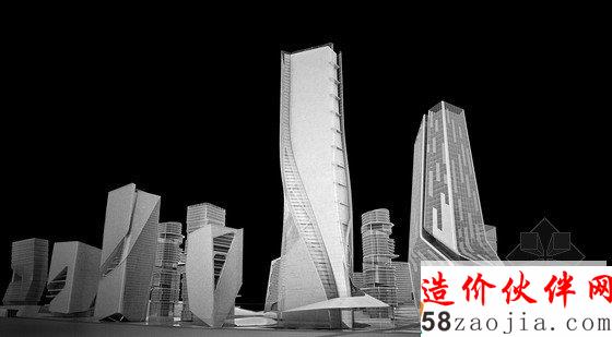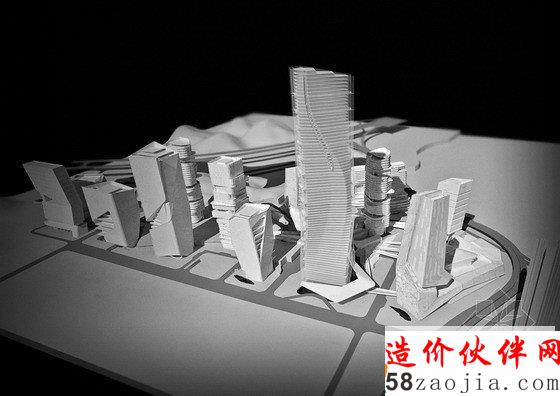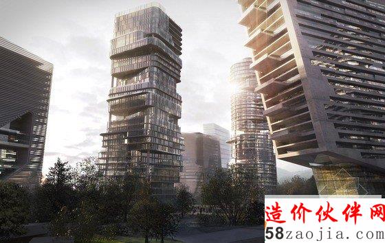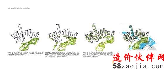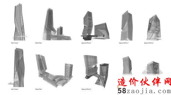 项目的组成以2座地标性建筑为核心,第一座地标性建筑高300米,坐落于穿越基地的溪流边上,受溪水流动性的启发,建筑楼体呈螺旋形上升,好像涌出地面的溪水。第二座标志性建筑为这个区域的购物中心,高220米,坐落于两条高速公路的交叉口,与高速公路相呼应,横向拉进了高速路与建筑群的距离,将塔楼,购物中心融入了400米范围的标志性建筑群。购物中心的内向外缘由阶梯状露台组成,一直通往绿色花园空间。