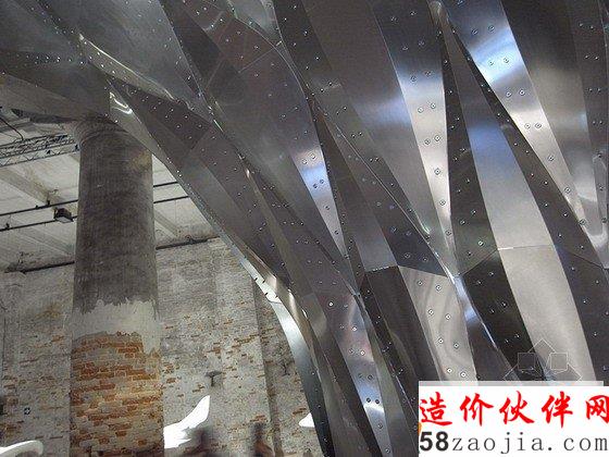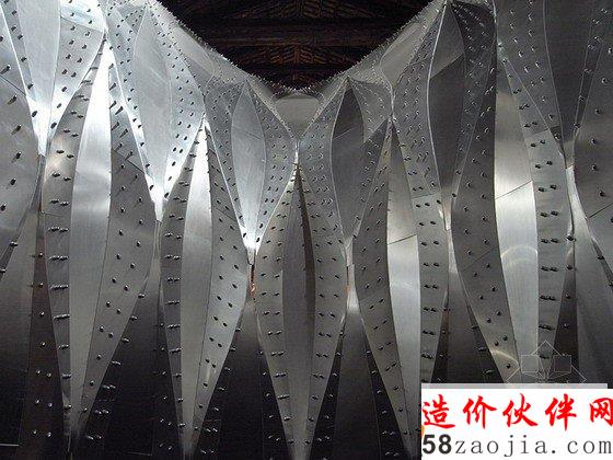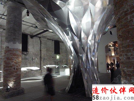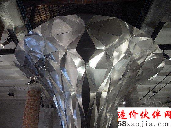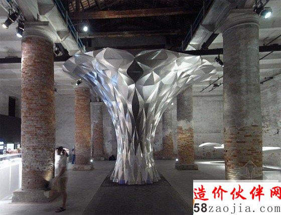 通过装置展览,事务所特别希望探索的是轻质壳体与可拉伸结构之间的关系。事务所设计的一些这样复杂的壳体和可拉伸的结构,在本次双年展上事务所将首次将两者结合在一起。Arum shell(尸臭魔芋壳体)是一个用褶皱金属做成的装置。