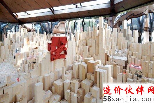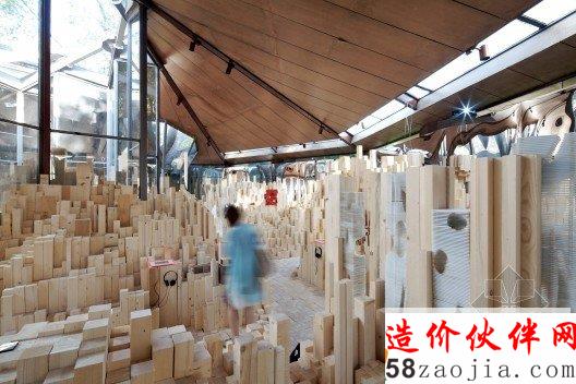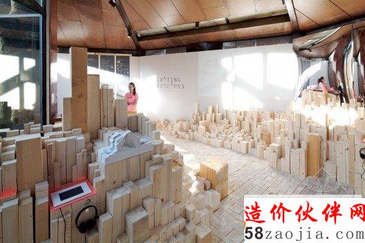 展馆的装置使用不同大小的未经加工的木材,形成一片木头组成的景观,每个设计师将自己的展品放入到整个结构之中,另外包含一个简单的视频,最终形成木头材料的粗糙感和它能生成的精细感之间的张力。