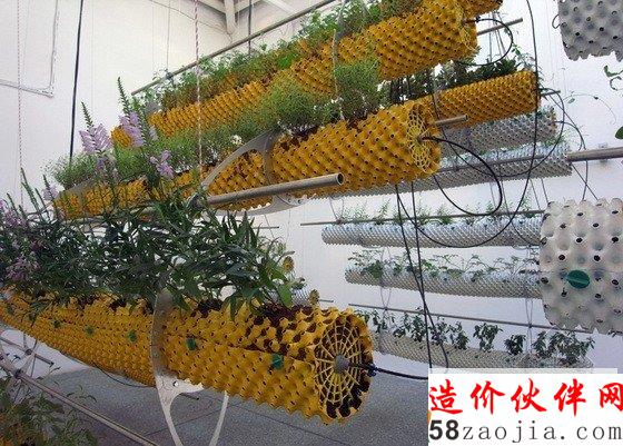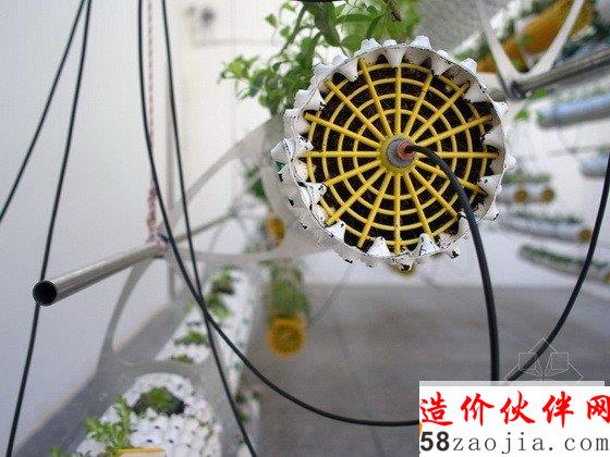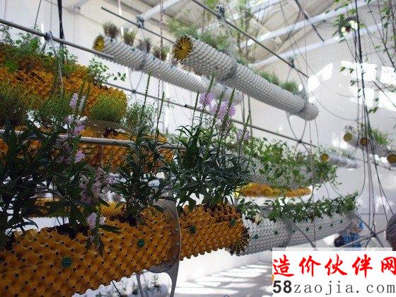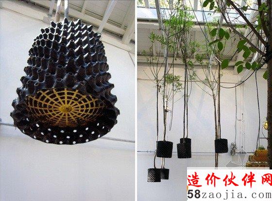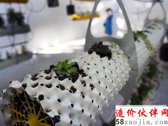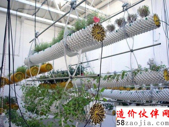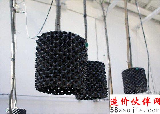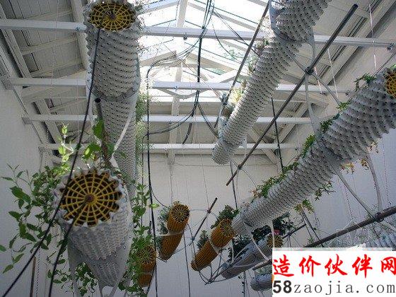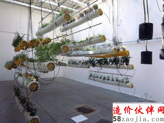 第十三届威尼斯建筑双年展西班牙馆中有一个“Between Air”(空气之间)的展览,这个项目探讨的是一种全新的自然状态及其与科技之间的关系。技术的发展解决了种植物产量和空间的问题,但是这个展览则利用传统的方法种植植物,试图转换人的思想模式,而不仅仅是一种材料产品。这个装置包括一系列悬空并连接的带孔圆柱体,它们由回收塑料做成,孔状结构将光线带入管道中,为根部提供营养,根部最终会到达孔状结构外部,并干化掉,从而实现不断的更新,形成放射状地生长而不是线性的生长。POREC浇灌管道对于弯曲和复杂的地理情况来说是完美的选择,因此它很适合这个多孔圆柱体,它的上面还有很多微型孔,可以360度提供均匀的浇水。水耕法使人们不用进行土壤维护,也增加了植物的产量,减少了成本。特殊设计的钢铁平板连接每个悬浮体,同时还有一个电缆滑车装置不停地调整盆栽与光源之间的距离,从而实现最佳的光热效果。