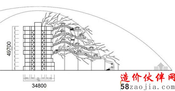 “一棵树”,实质是一个冠幅达135米,高达50米的生态立体木屋集群。其中树干实质为一个类圆柱状楼体(由200间木结构客房构成),中空天井,设电梯和防火装置。