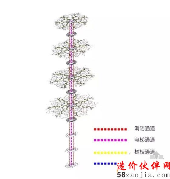 树冠由6条旋转放射的主枝干为主结构,既作为交通干道,也为上面20-40个树叶状或鸟巢型客房提供力学支撑。