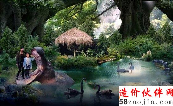 运用夏岩专利塑石塑树工艺打造的虬曲苍劲的树妖\“根抱石”等仿真景观本身已足够震撼眼球,而将蜥蜴\蟒蛇这些危险而神秘的爬行动物隐藏于树洞之间进行展示,相得益彰。 “一棵树”儿童捕鱼池