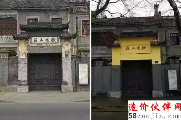 秋水山庄为上世纪30年代著名报人史量才以爱妻沈秋水的名字命名修建,是杭州市级文物保护点。按管理方的说法,这次是想“修旧如旧”,按照史料将门楼从灰色恢复为黄色,但选的黄漆颜色太艳、不够协调,“出发点是好的,但好心办了坏事”。