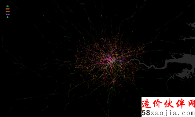 图1. 典型的伦敦公共交通服务工作日早上8:30的一个快照。颜色编码的旅行风格:绿色的铁路服务,红色的巴士服务,黄色的巴士服务(更大区间的巴士服务),紫色的地铁服务和蓝色的渡轮服务