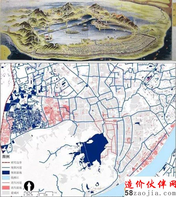 图3 上:1930年的杭州,运河水网和西湖 下:近年城市发展对湿地河网的破坏(红色为消失的湿地河道) 其三,单目标技术为导向,缺少综合价值。绿色基础设施是一个多目标的综合性实践,雨洪管理是其中的重要功能,但不是全部。我们现在能够看到很多植草沟、下洼绿地、滞留池等绿色技术措施示范,这是个进步。但是,这些技术没有人的体验和参与,不足以给人美的享受,是纯粹的工程技术。既然我们叫做“海绵城市”,就不能仅关注水量水质的单目标技术实践,而应与城市发展、生物保护、市民休闲、身心愉悦、社区参与的多方面相协调。因此,统筹专业技术,通过对城市空间的综合设计,发挥海绵城市的全面价值才是应有之意,目前我们在这方面还不够。