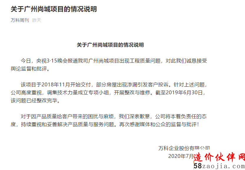 万科回应广州尚城项目:诚恳接受批评 去年已整改完毕 时间:2020-07-17 22:18 来源:新华网 作者: 点击:次 图集 昨日,央视3·15晚会报道万科广州尚城项目出现工程质量问题。对此万科表示,诚恳接受舆论监督和批评。 万科昨晚发表声明称,该项目于2018年11月开始交付,部分房屋出现渗漏引发客户投诉。针对上述问题,万科高度重视,调集技术力量成立专项小组,开展整改与维修。截至2019年6月30日,该问题已经整改完毕。 万科同时表示,对于因产品质量给客户带来的困扰与麻烦,深表歉意,万科将本着负责任的态度,持续重视和妥善解决产品质量与服务问题。感谢媒体和公众的监督与批评。 (责任编辑:建筑小白)