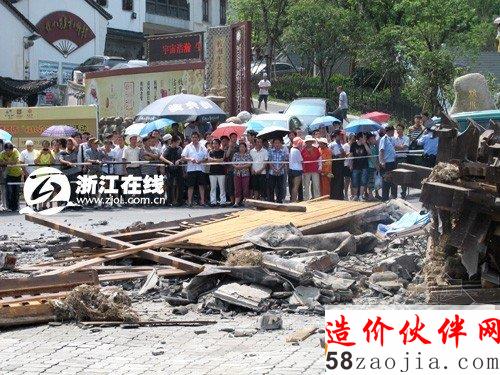 杭州某闹市景点牌坊倒塌致2死3伤 时间:2012-08-19 10:10 来源: 作者: 点击:次 事故现场狼藉一片 8月12日上午9点37分,浙江省杭州市吴山广场一牌坊倒塌。经初步确定,事故造成2人死亡,3人受伤,其中2人轻伤,1人骨折。 该牌坊位于该市吴山广场花鸟城前,是游人进入仿古建筑——清河坊街的主通道之一,是较为知名的旅游景点,游客如潮,事发当天为周日。 事故原因正在进一步调查中。 (责任编辑:建筑小白)