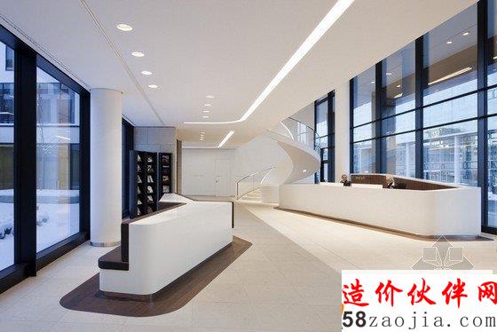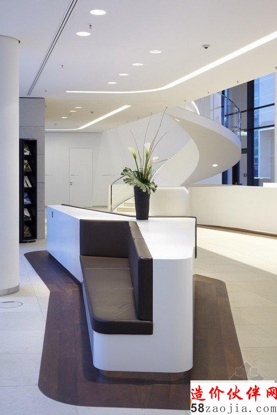 整个建筑的造型体现了公司的理念——每件事情都讲求品质,办公楼里有大厅、咖啡厅、会议室、礼堂、管理区和工作区。大厅里使用了明亮优雅的色调,设计师反复使用了木材,天然石料和可丽耐大理石作为设计元素,营造出自然、温馨的气氛。地毯和所用到的皮革主要是波尔多红色的,在整个大环境映衬下显得尤为显眼。礼堂里的布置就充分体现了整个办公楼的装饰特色。图书馆分为接待区、阅览区和借阅区。咖啡厅则主要营造了友好轻松的气氛。